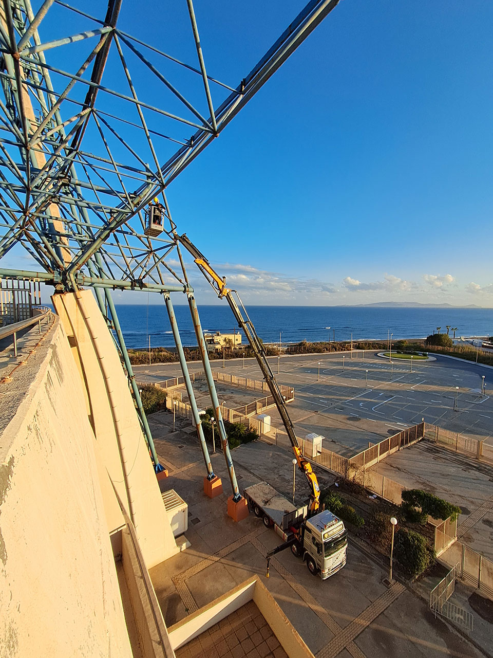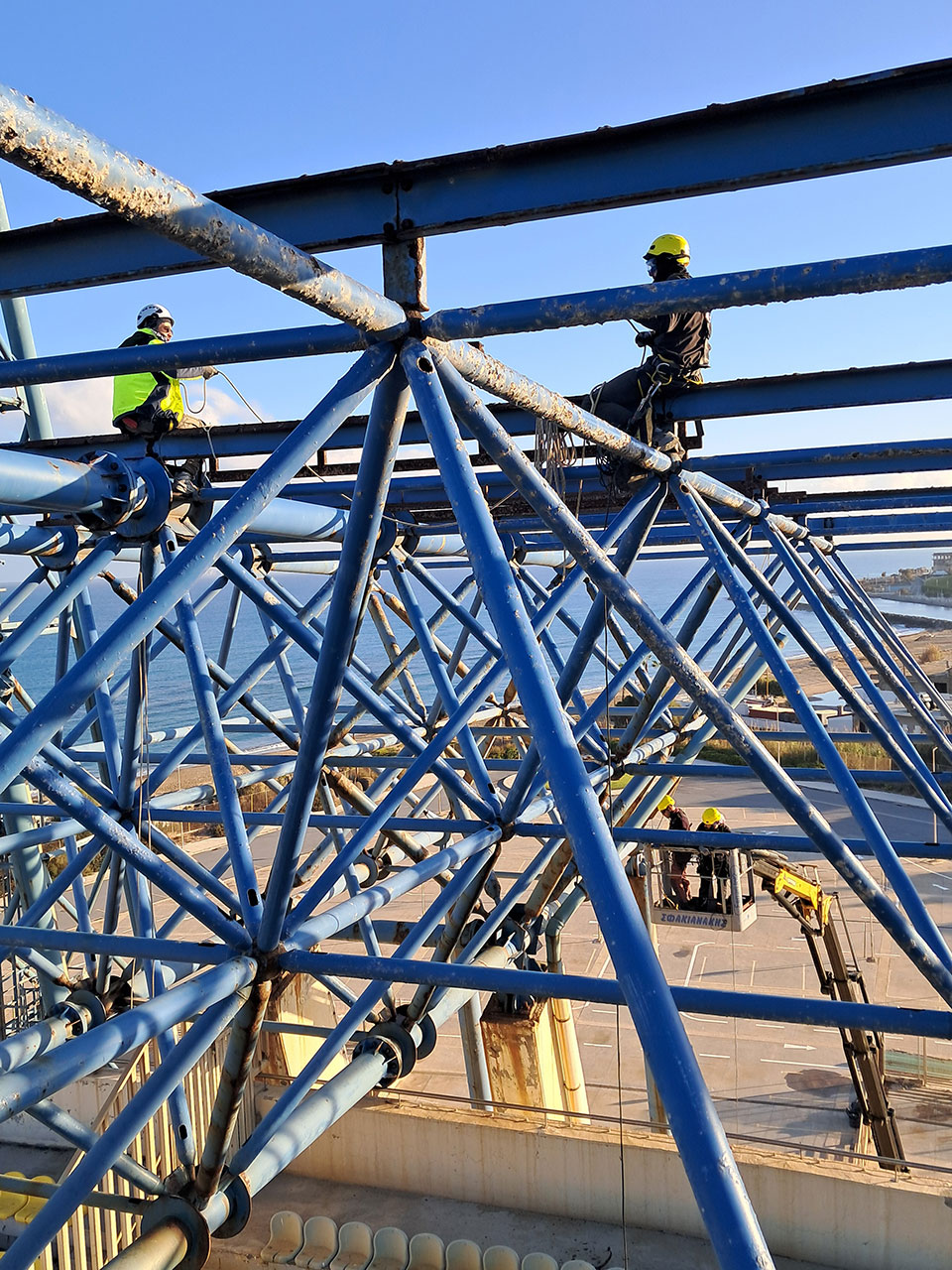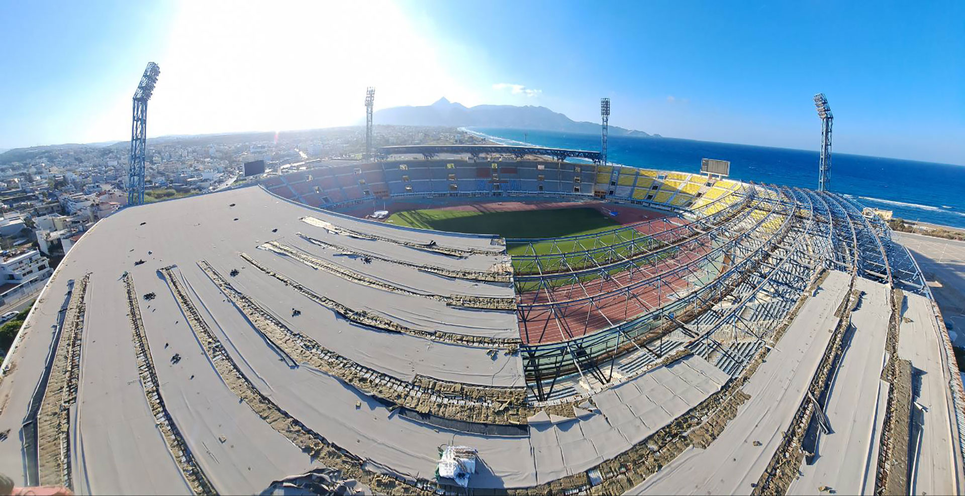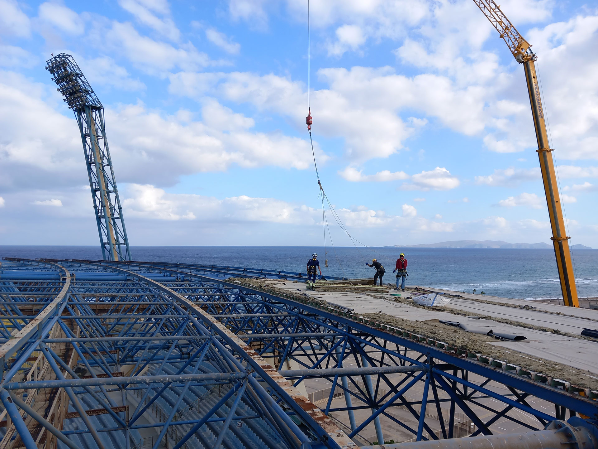 Η εταιρεία μας, σε συνεργασία με την LYDAKIS Construction, ανέλαβε τις εργασίες αφαίρεσης 6.000 m² υφιστάμενης τραπεζοειδούς λαμαρίνας με τη μονωτική επικάλυψή της από το ανατολικό στέγαστρο του Παγκρήτιου σταδίου έπειτα από την αποκόλλησή της λόγω έντονων καιρικών φαινομένων.