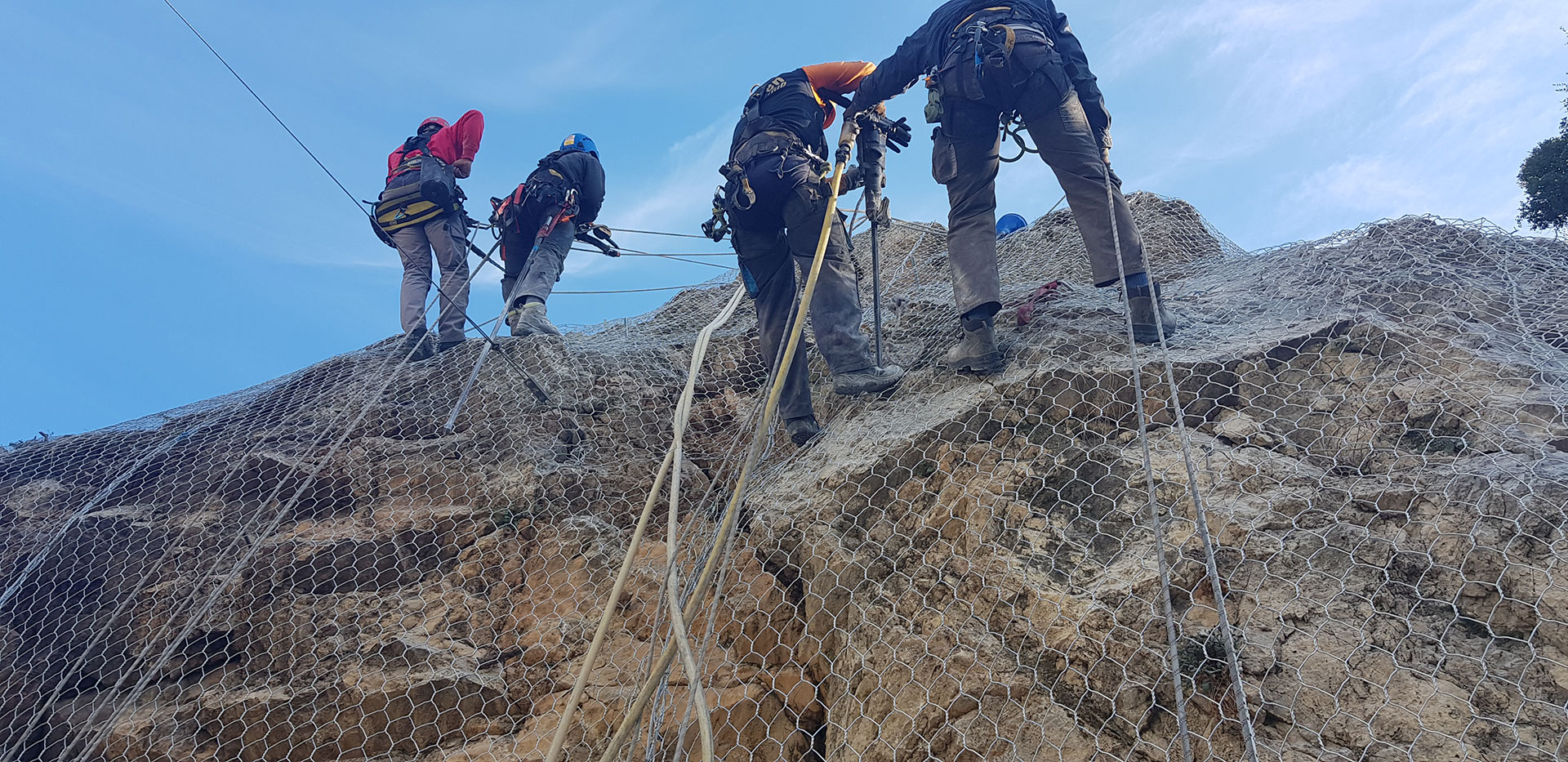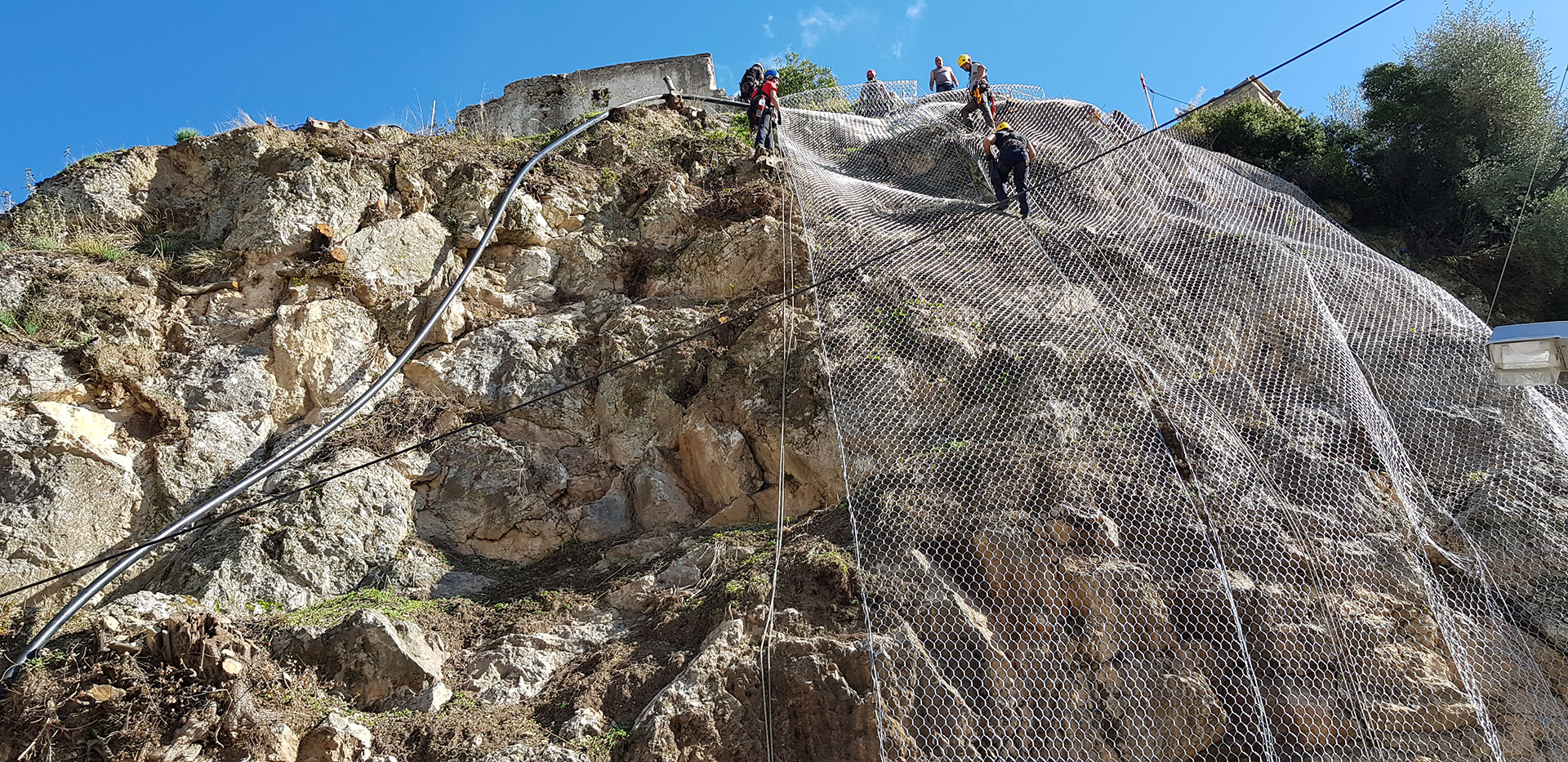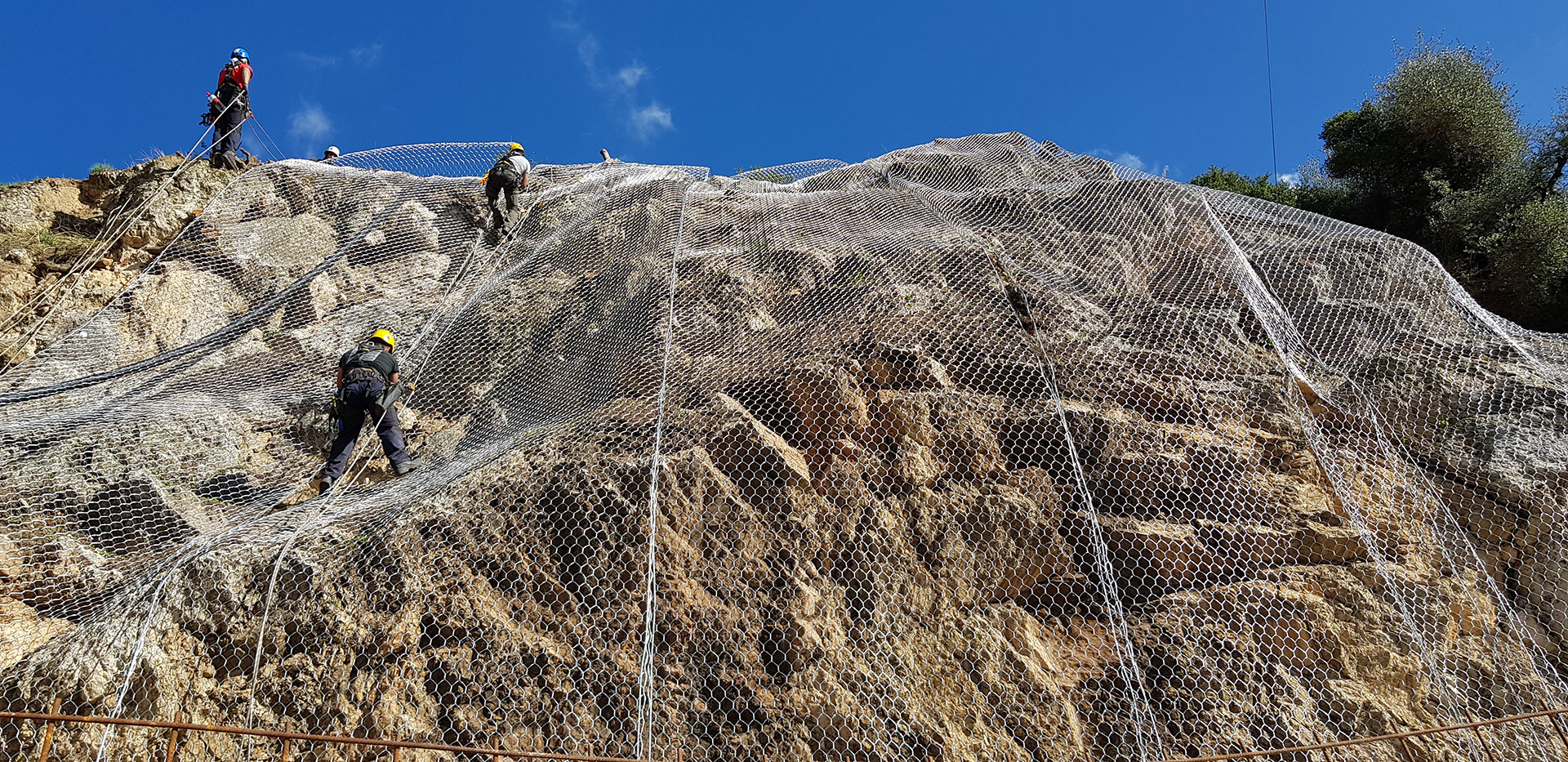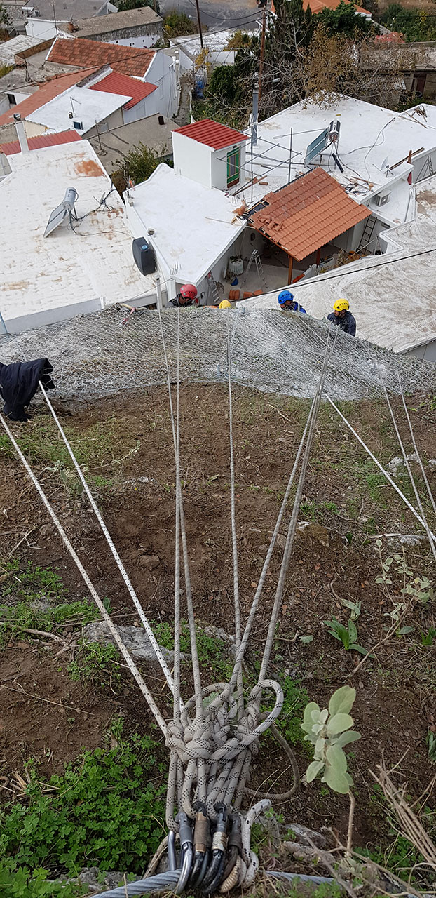 Στη συνέχεια, επενδύσαμε το πρανές με πλήρως αγκυρούμενο γαλβανισμένο συρματόπλεγμα και εφαρμόσαμε αγκύρια ολόσωμης πάκτωσης με ράβδους Φ25 B500C, μέχρι βάθος 3 μέτρων με χρήση αερομπίστολων.