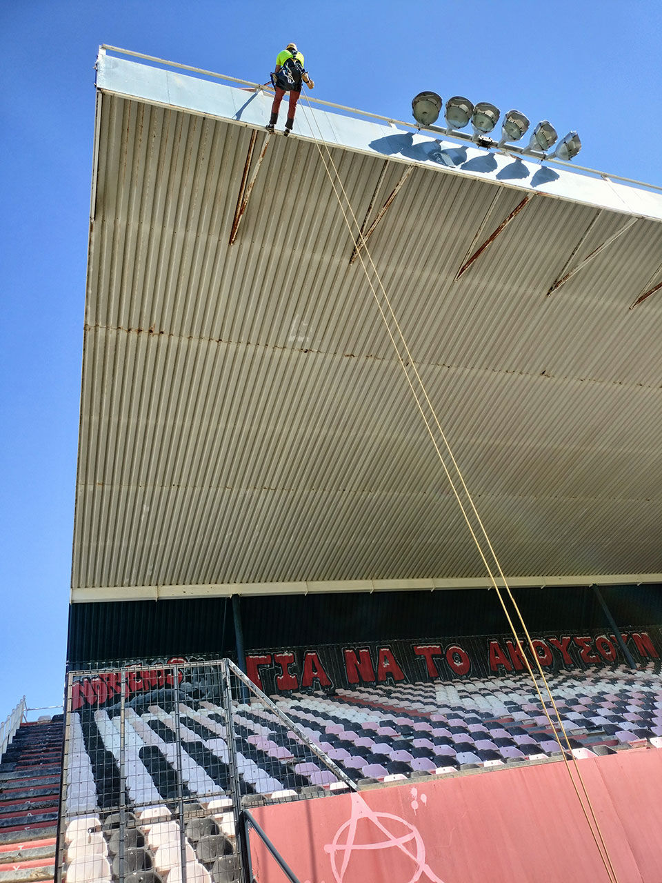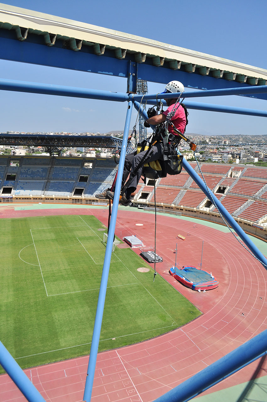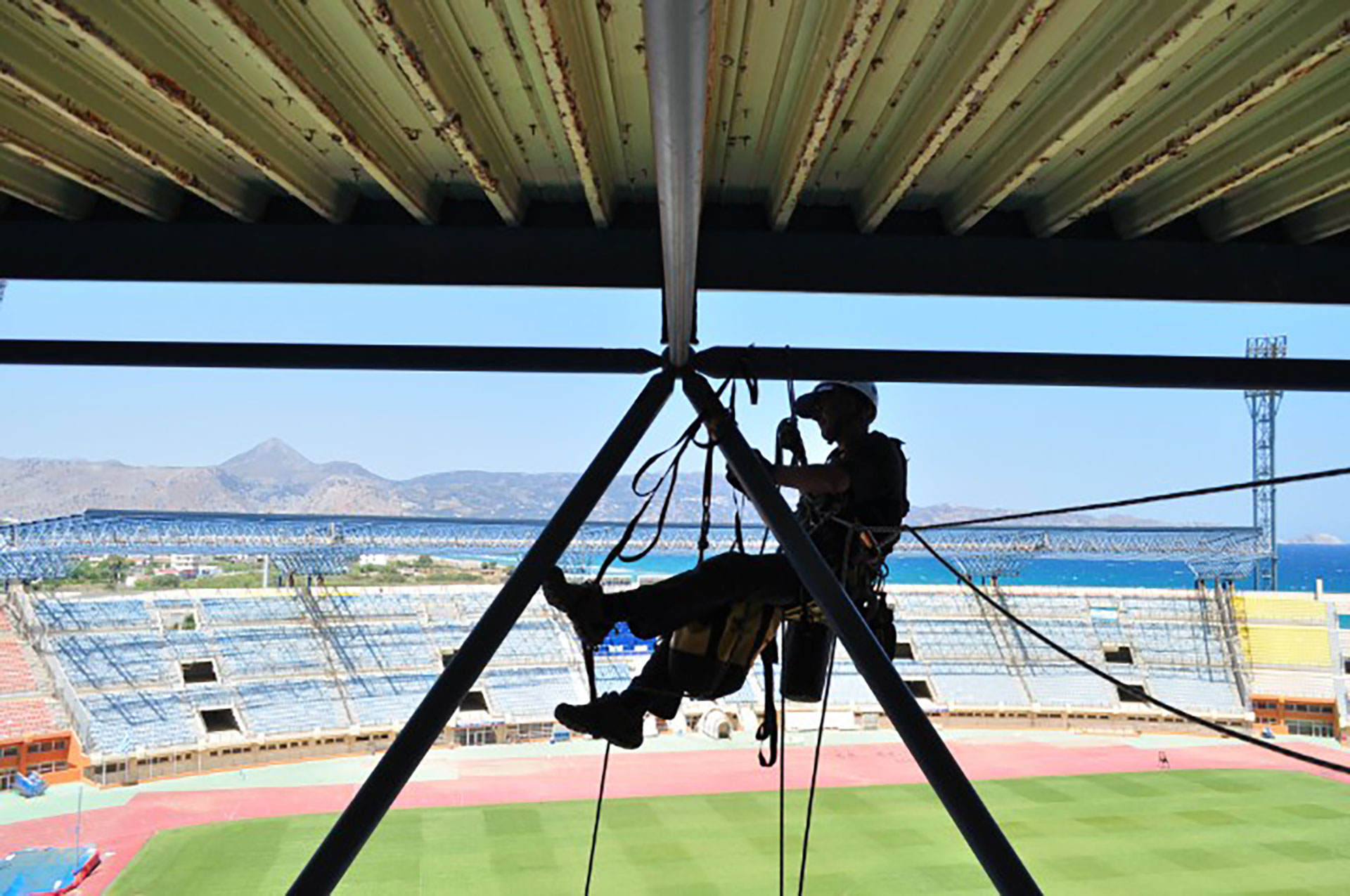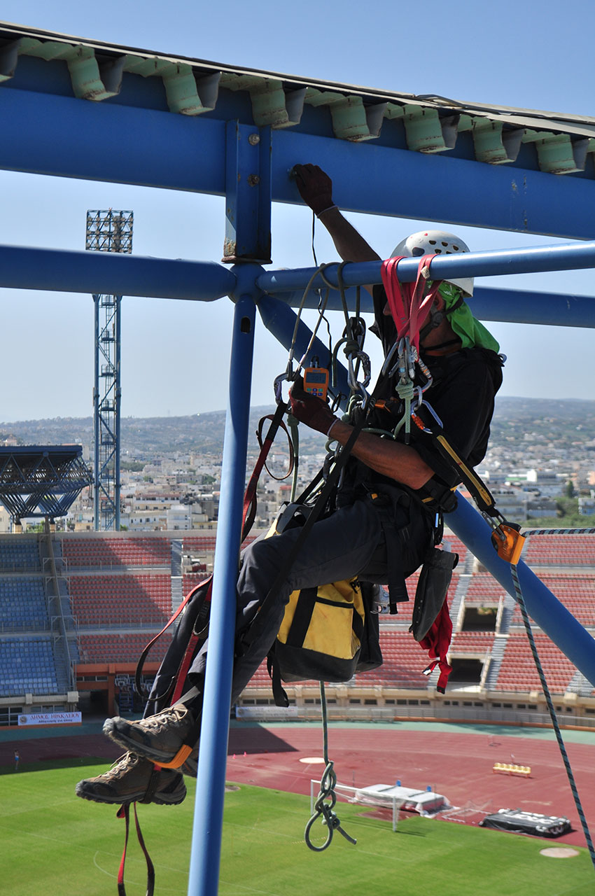Η δυνατότητα με τη χρήση μεθόδων rope access να προσεγγίζουμε δυσπρόσιτα σημεία καθώς και η πανεπιστημιακή μας ιδιότητα ως πολιτικοί μηχανικοί, εφαρμόστηκαν στον έλεγχο στατικής επάρκειας μεταλλικών στεγάστρων του Παγκρήτιου και Παναχαϊκού σταδίου.