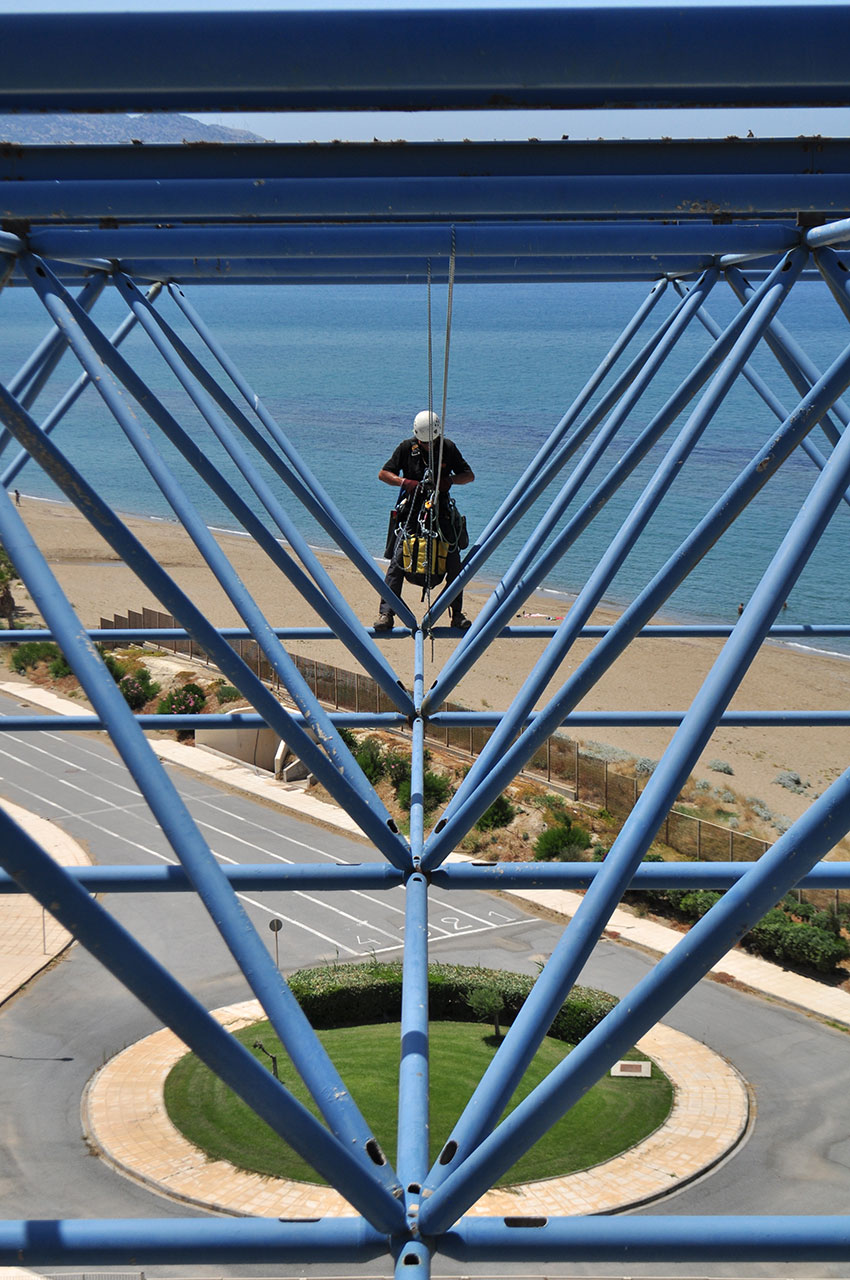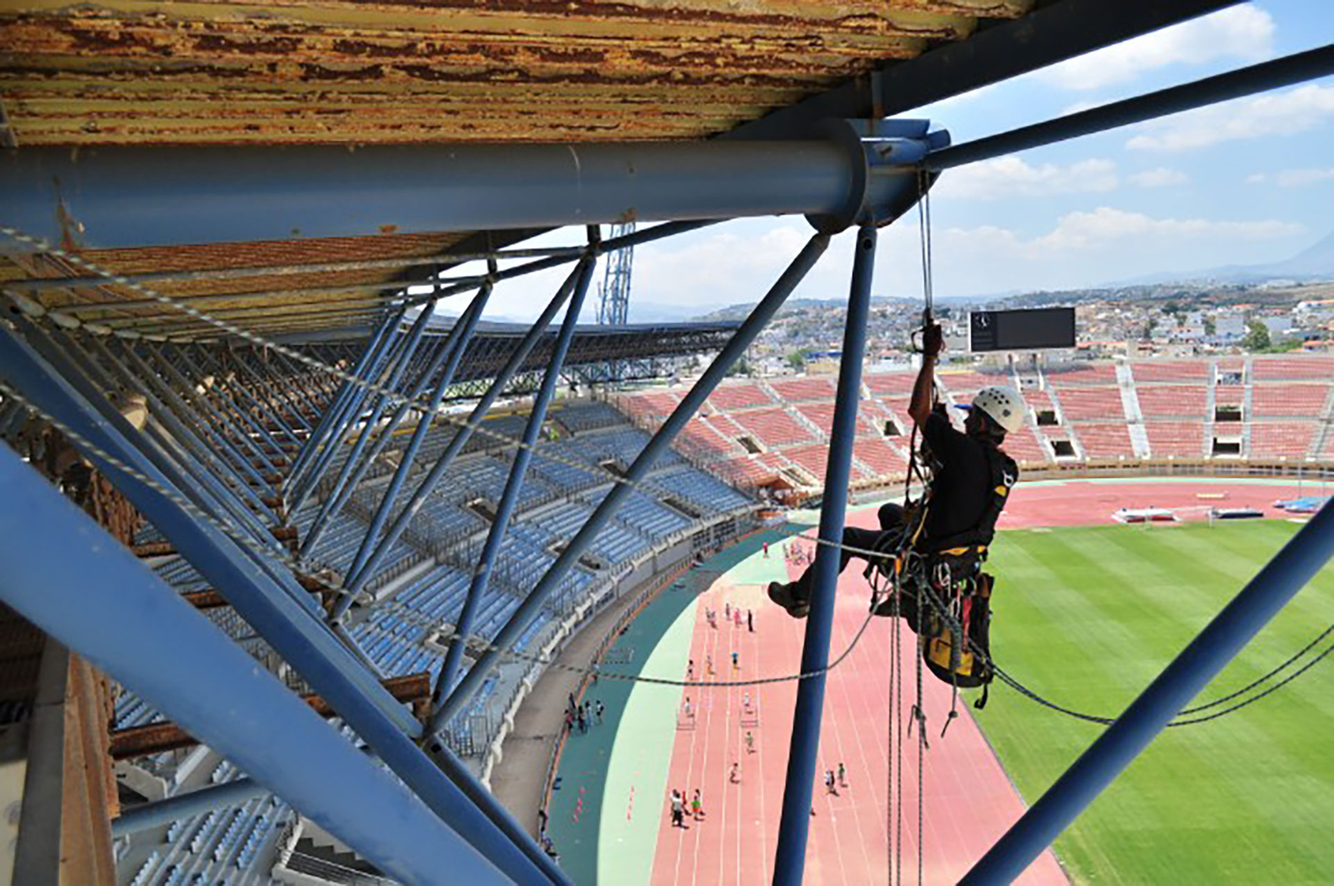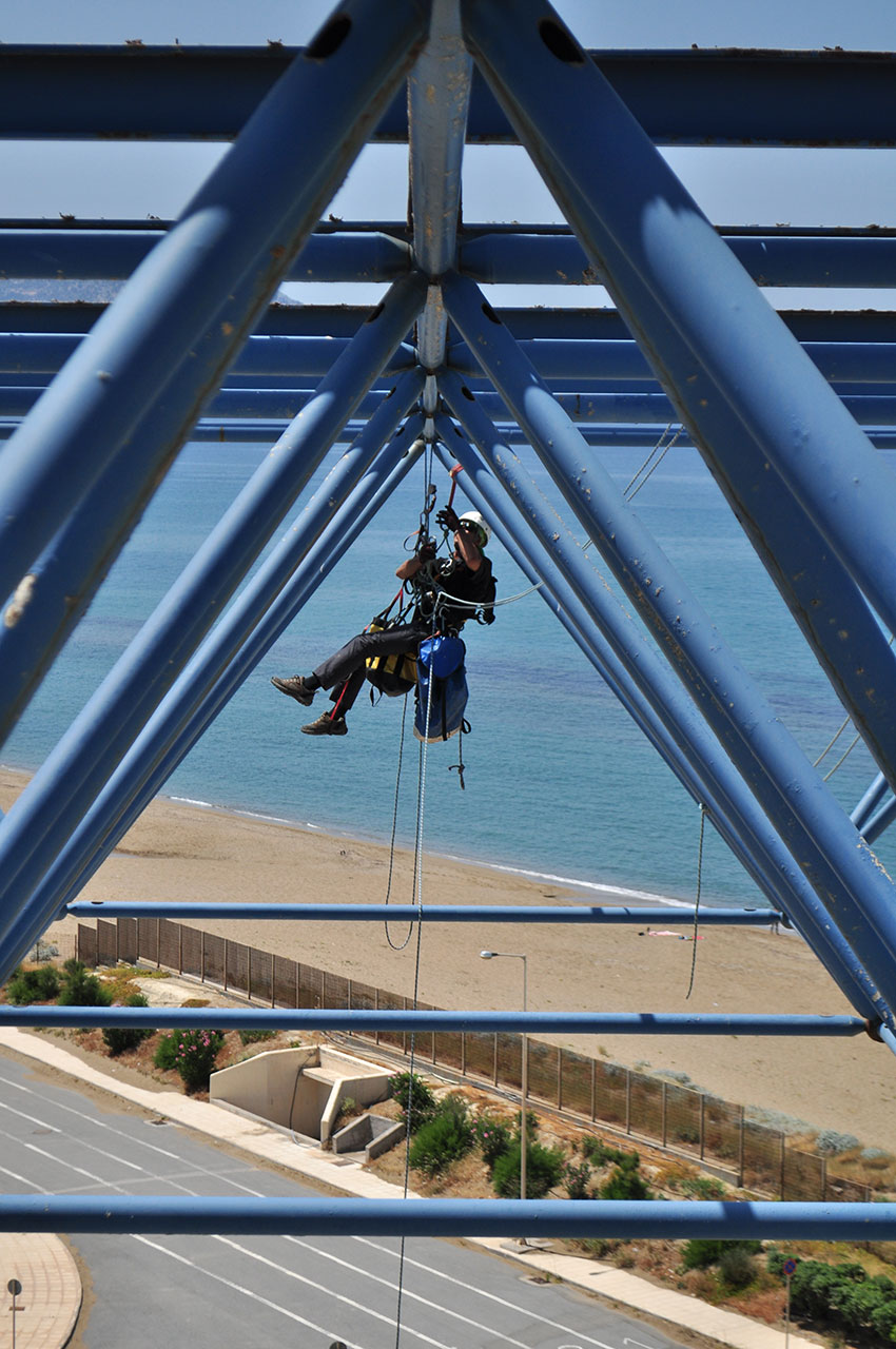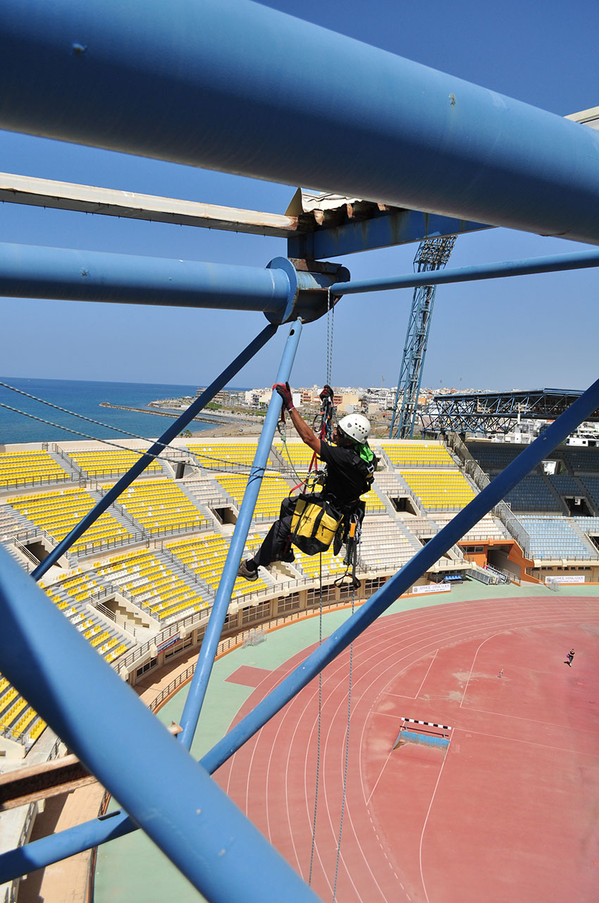 Η δυνατότητα με τη χρήση μεθόδων rope access να προσεγγίζουμε δυσπρόσιτα σημεία καθώς και η πανεπιστημιακή μας ιδιότητα ως πολιτικοί μηχανικοί, εφαρμόστηκαν στον έλεγχο στατικής επάρκειας μεταλλικών στεγάστρων του Παγκρήτιου και Παναχαϊκού σταδίου.