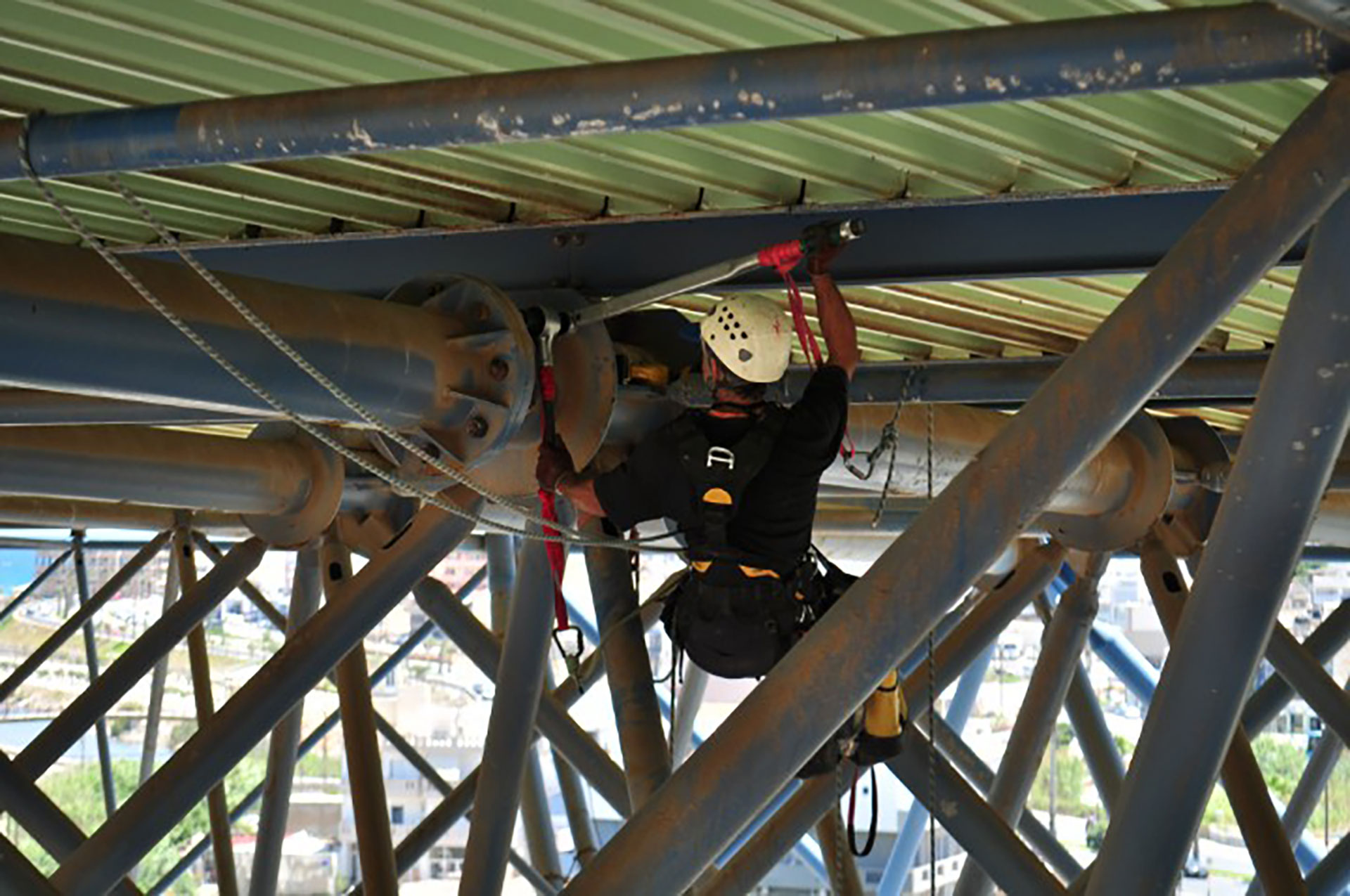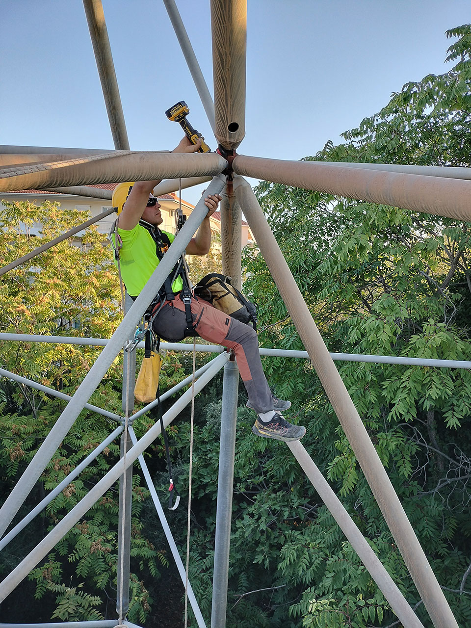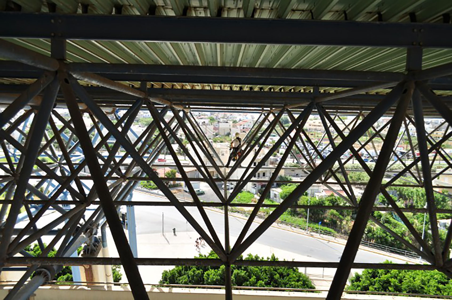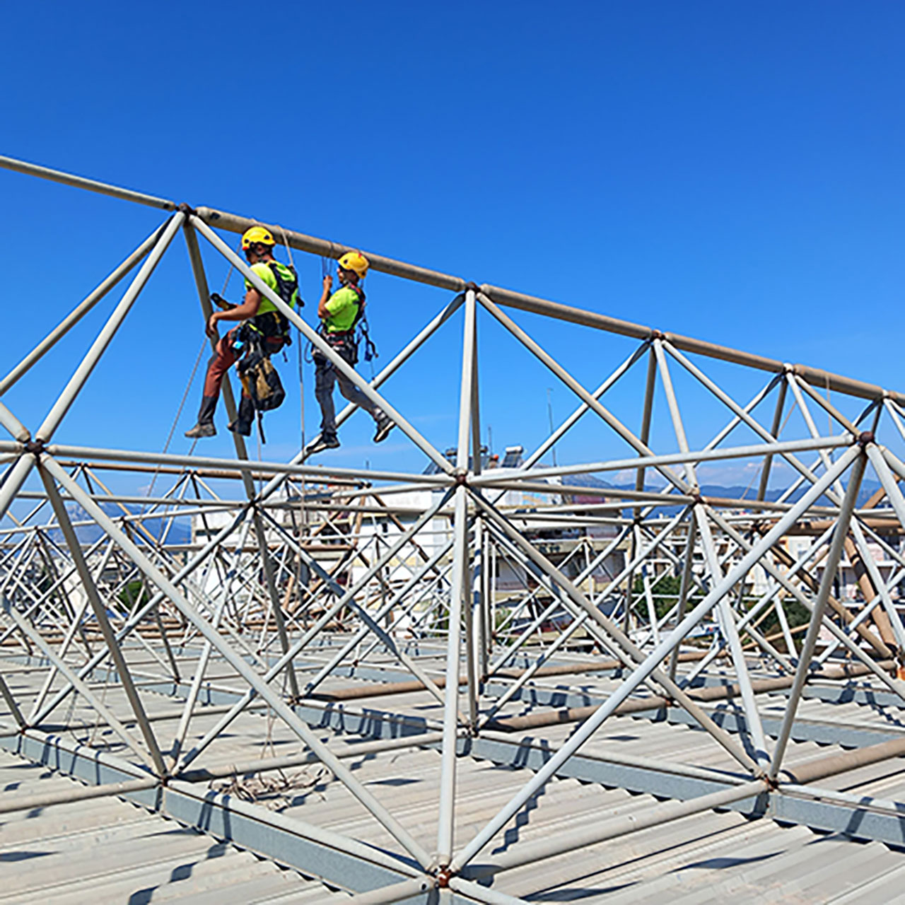 Η δυνατότητα με τη χρήση μεθόδων rope access να προσεγγίζουμε δυσπρόσιτα σημεία καθώς και η πανεπιστημιακή μας ιδιότητα ως πολιτικοί μηχανικοί, εφαρμόστηκαν στον έλεγχο στατικής επάρκειας μεταλλικών στεγάστρων του Παγκρήτιου και Παναχαϊκού σταδίου.