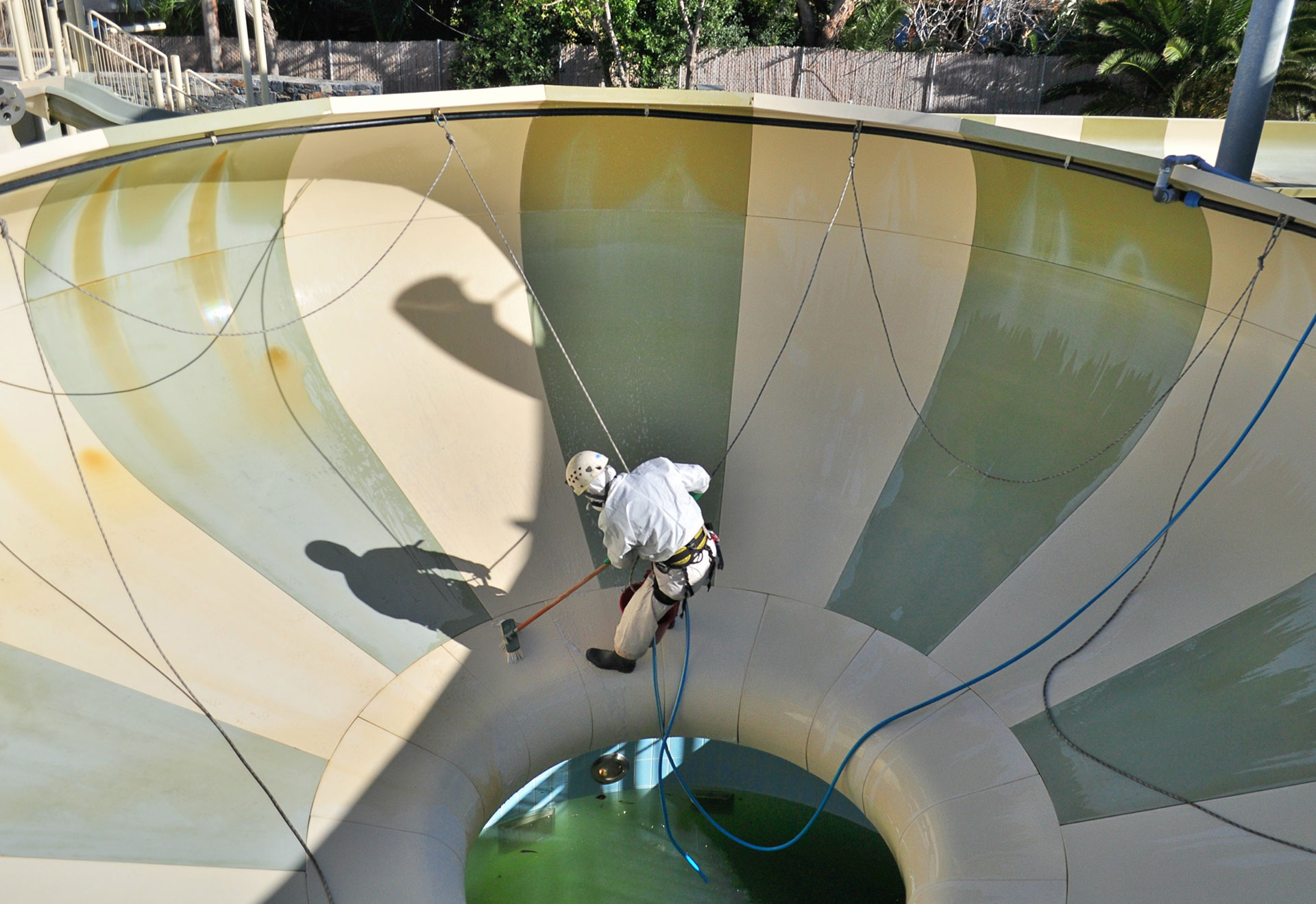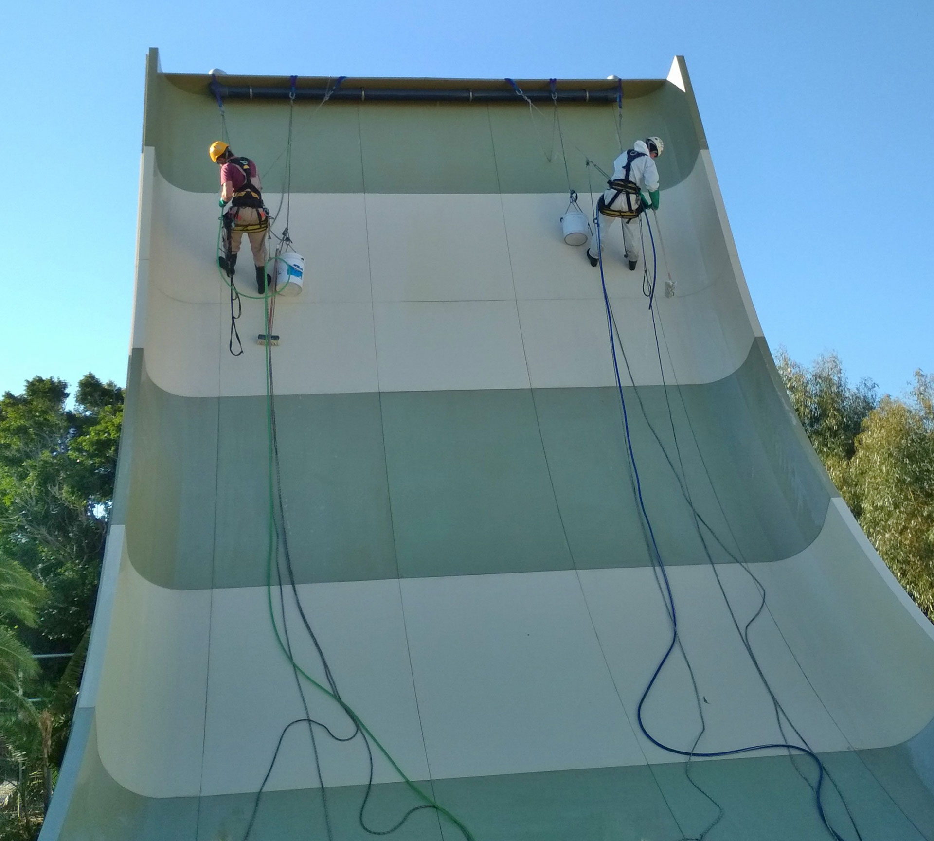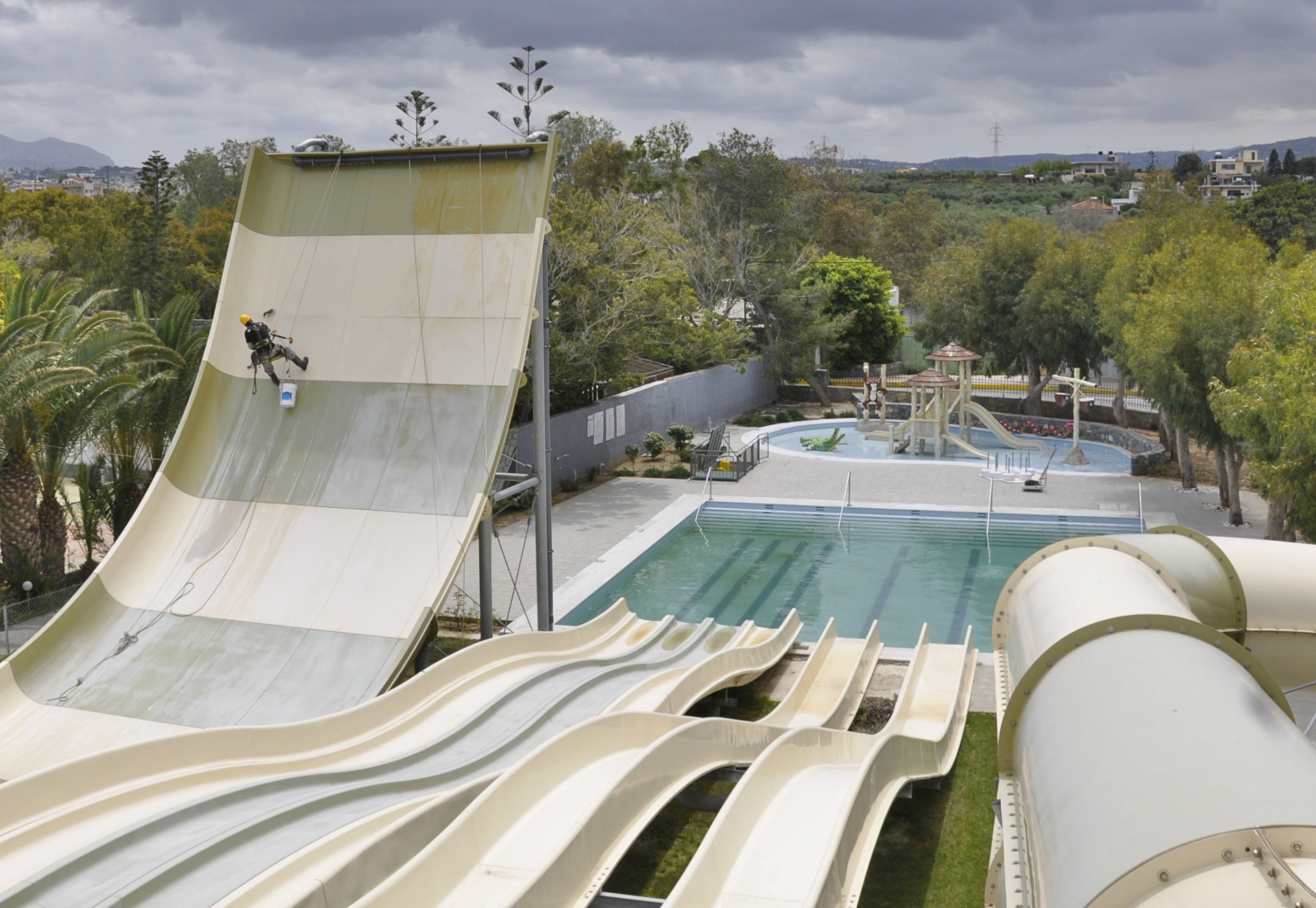 Η εταιρεία μας εφάρμοσε μεθόδους πρόσβασης με σχοινιά, με σκοπό την επάλειψη με χημικό υγρό της πολυεστερικής επιφάνειας των νεροτσουληθρών στο water park του ξενοδοχείου.