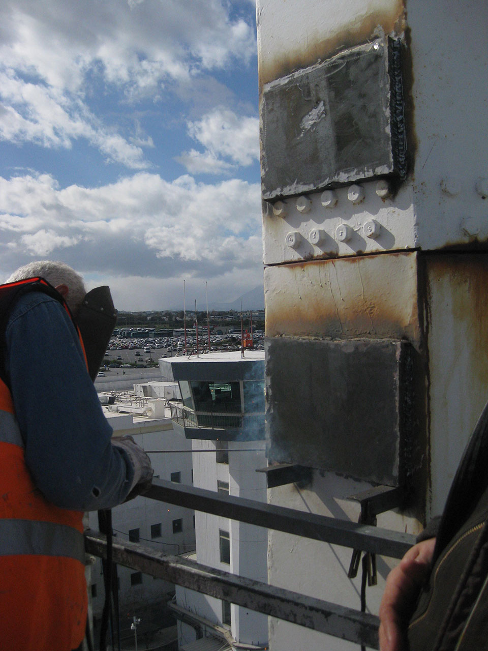 - η ηλεκτροσυγκόλληση, με τη βοήθεια καλαθοφόρου οχήματος, των μεταλλικών στελεχών των πυλώνων που είχαν υποστεί αστοχία.
